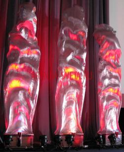 Аэрофонтаны - это тканевые "мешки" на мощном воздушном потоке высотой более 2 метров с подсветкой - родственники имитации пламени, отличающиеся от имитации огня устойчивостью или быстрой восстанавливаемостью при применении на открытом воздухе. Мы обычно изготавливаем тканевые элементы высотой в 5 метров. Ткань аэрофонтана может быть любого цвета, например, часто арендуют 3 аэрофонтана: синего, красного и белого цветов для имитации развевающегося Российского флага (в день Независимости России, например); серебристые и золотистые парчевые аэрофонтаны арендуют в качестве декораций детских мероприятий и фестивалей.