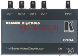 Kramer 6104 – многоформатный цифровой усилитель, распределитель 1:4 SDI. Он не нуждается в подстройке, имеет устойчивую АЧХ и функцию перетактрования на выходах, что позволяет ему формировать четыре последовательных цифровых выходных сигнала с низким уровнем джиттера. Устройство автоматически компенсирует ухудшение характеристик сигнала в коаксиальном кабеле 75 Ом (длиной до нескольких сотен метров, в зависимости от типа кабеля и формата видео). Любой из форматов видео(4fsc PAL, 4fsc NTSC, компонентного сигнала 4:2:2 и широкоформатного 16:9) распознается автоматически. Устройство позволяет работать и с 10битовыми, и с 8-битовыми видео, автоматически распознавая длину слова. В комплект входит источник питания 12 В. 6104 относится к семейству DigiTOOLS – группе высококачественных и компактных приборов с оптимальным соотношением «ценакачество» и широким спектром применения.